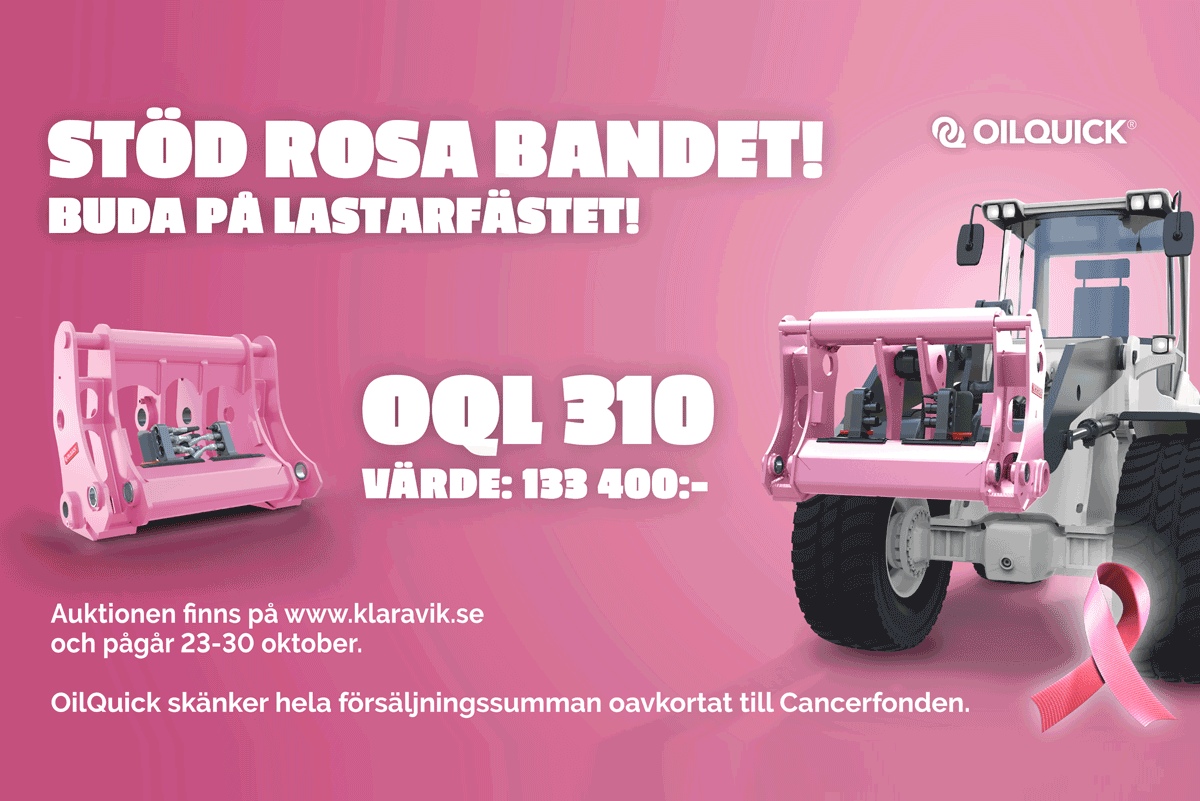 OilQuick fortsätter kamp mot bröstcancer – auktionerar ut unikt rosa hjullastarfäste